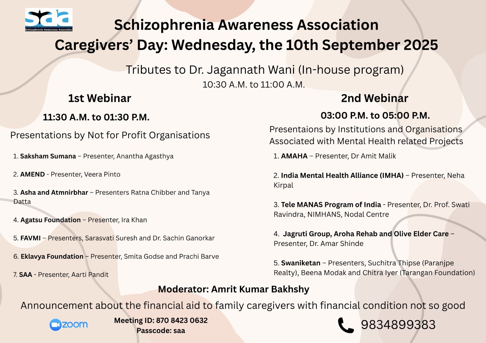 4:00 pm - 5:30 pm “आईना मन का” September 20 @ 4:00 pm - 5:30 pm “आईना मन का” Join Zoom Meeting https://us02web.zoom.us/j/83695491646?pwd=VEx6ZGhVRzdPYmloVVFRaElZby85UT09 Meeting ID: 836 9549 1646 Passcode: saa